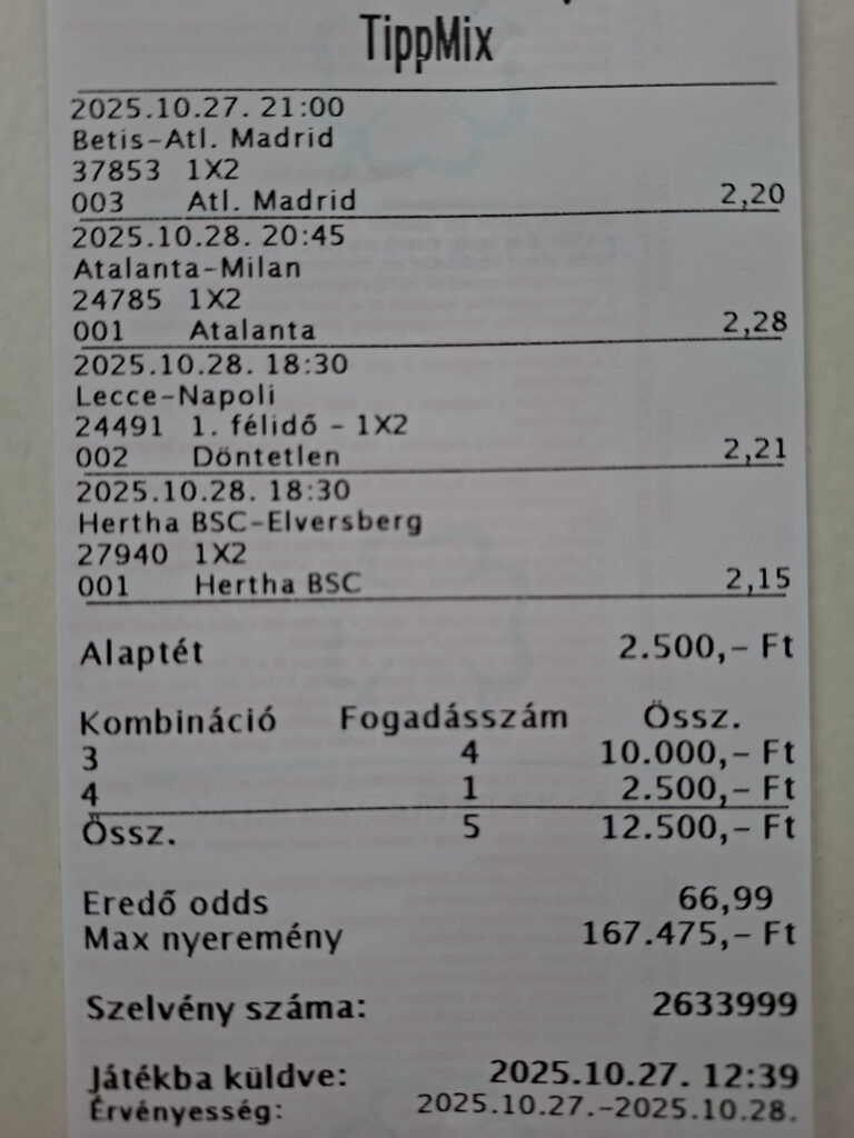 Hétfő keddi 3/4 racionális Tippmix szelvényünk – 10.27.