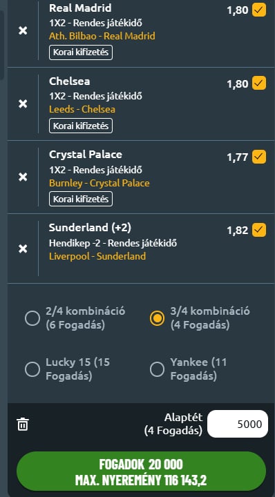 - Ferencáros győzelme (1X2 – korai kifizetés) @ 5,25