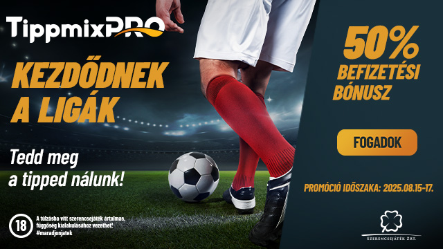 Regisztrálj vagy jelentkezz be a Tippmixpro-ra, használd a BONUSZ0815 kódot, és szerezd meg az 50% befizetési bónuszt 15 000 Ft-ig még ma!