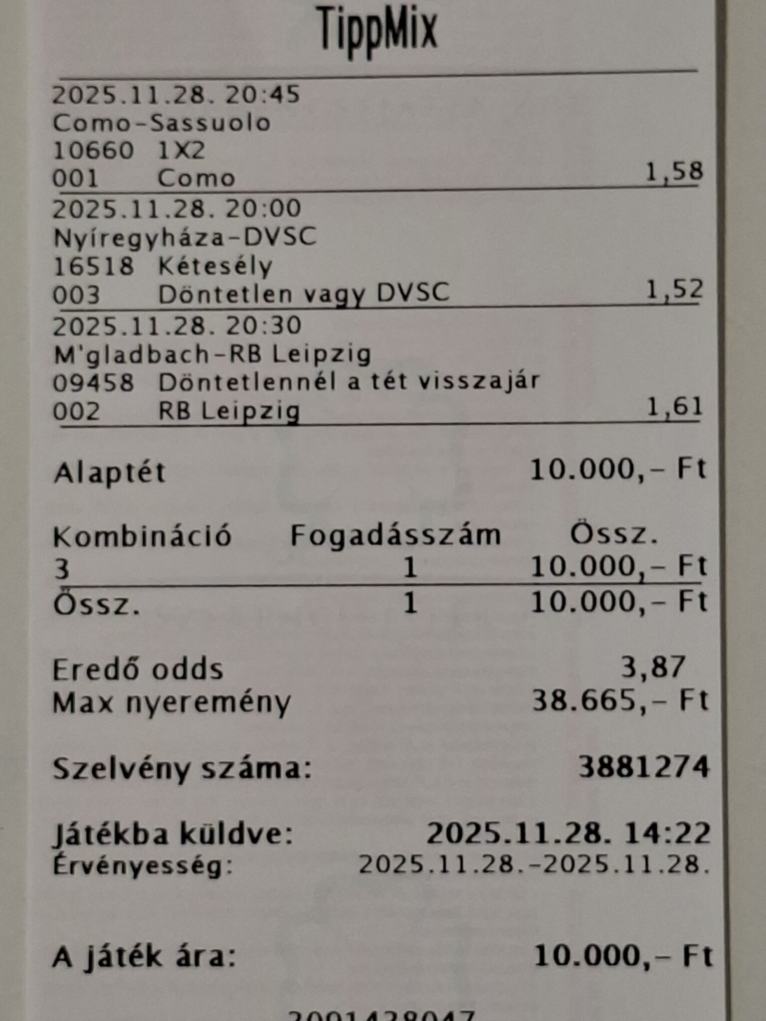 A lottózók zárva tartanak, ahogy az egész Szerencsejáték Zrt. fogadási rendszere is leáll (fizikai értékesítőhelyek). Ez azt jelenti, hogy sem online, sem SMS-ben, sem OTP bankautomatákon nem tudunk fogadni Tippmix illetve Tippmix V Sport opciókra! A Szerencsejáték Zrt. elektronikus online fogadási rendszere nem áll le (pl. e-sorsjegy, lottó, kivéve a Tippmix és a Tippmix V Sport!) - December 26. (Karácsony második napja):
