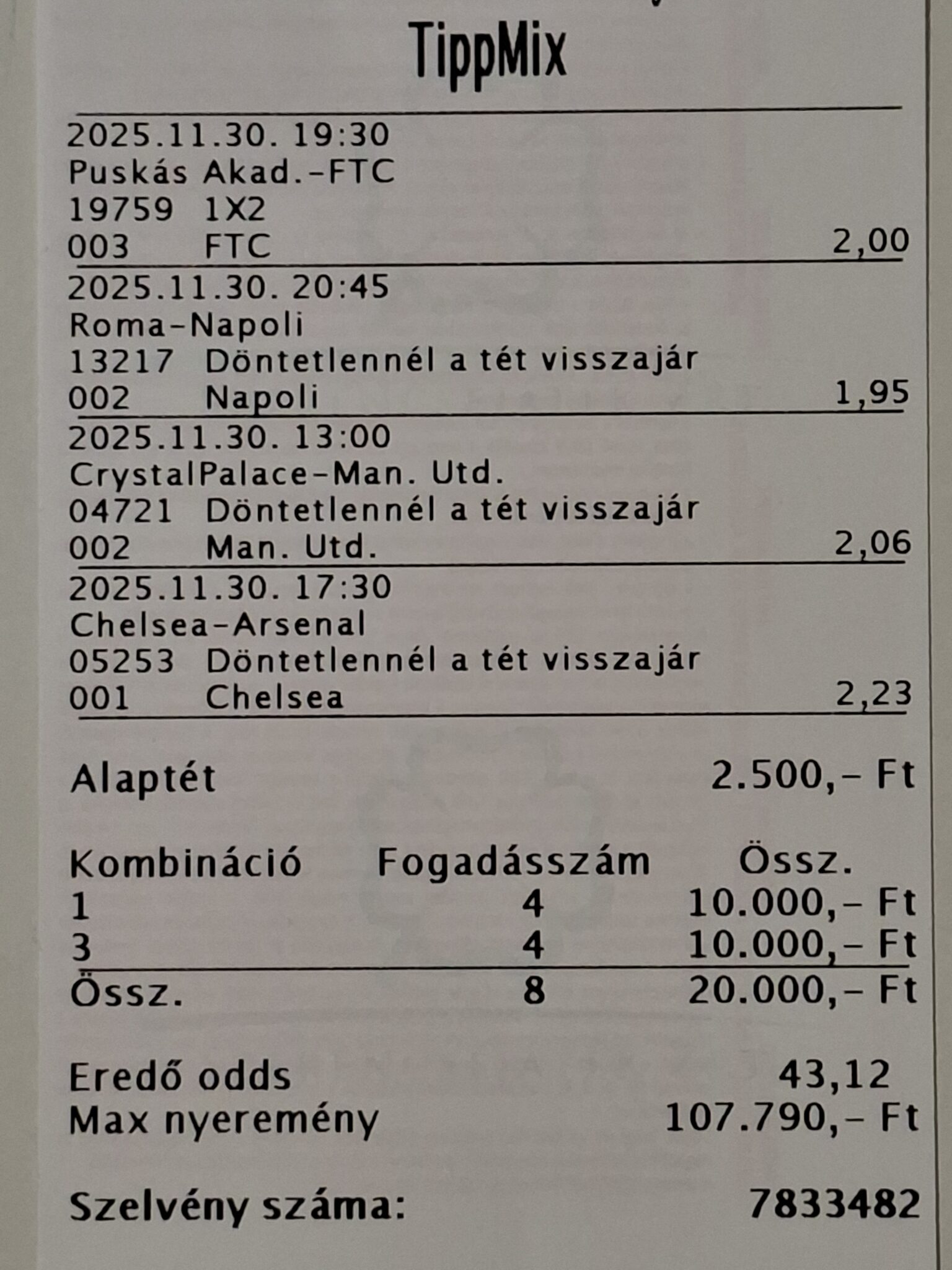 Ezek tájékoztató jellegű példák, a pontos piacok és szorzók mindig a Tippmixpro-n érhetők el, fogadás előtt ott ellenőrizd az aktuális értékeket.